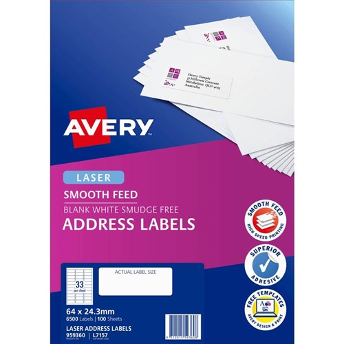 Avery Address Laser White L7157 64x24.3mm 33UP 3300 Labels 100 Sheets