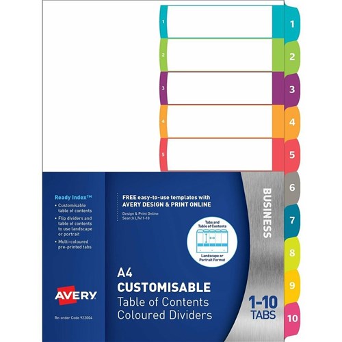 Avery L7411-10 Customisable Dividers A4 1-10 Index Tabs Bright Assorted