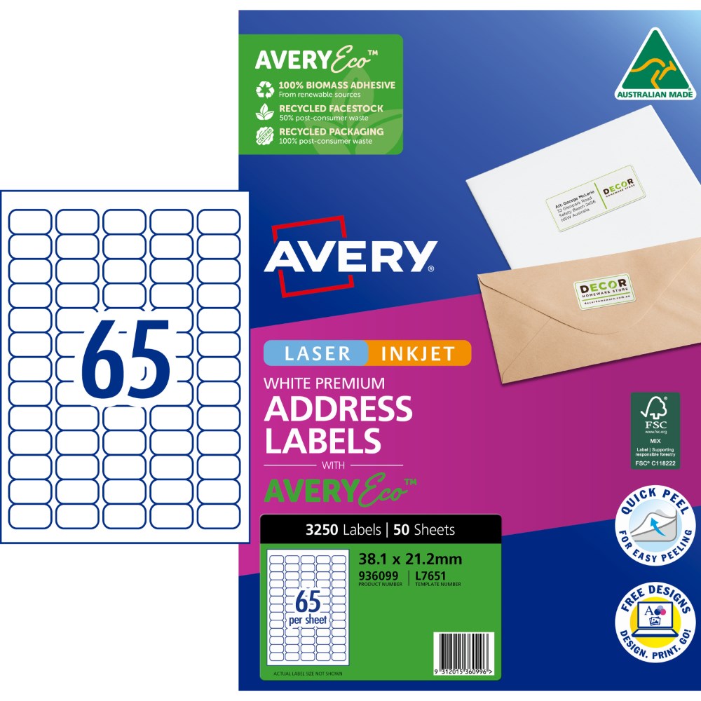 Avery Premium Address Labels White Laser Inkjet AveryEco L7651 38.1x21.2mm 65UP 3250 Lb