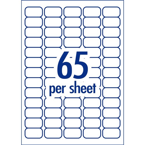 • Size: 38.1 x 21.2mm, 3250 labels, 50 sheets, 65 labels per sheet (65UP).