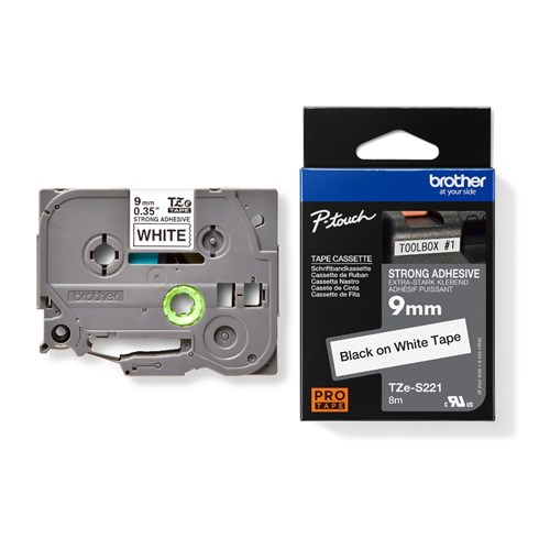 Brother TZE-S221 P-Touch Tape 9mmx8m Black on White Strong Adhesive