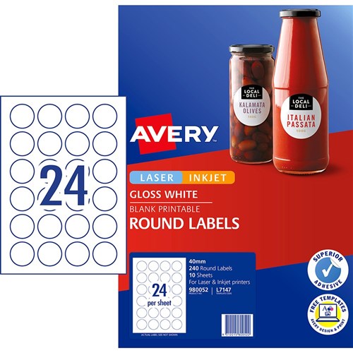 Avery Blank Printable Labels L7147 40mm Round Gloss White 24UP 240 Labels 10 Sheets