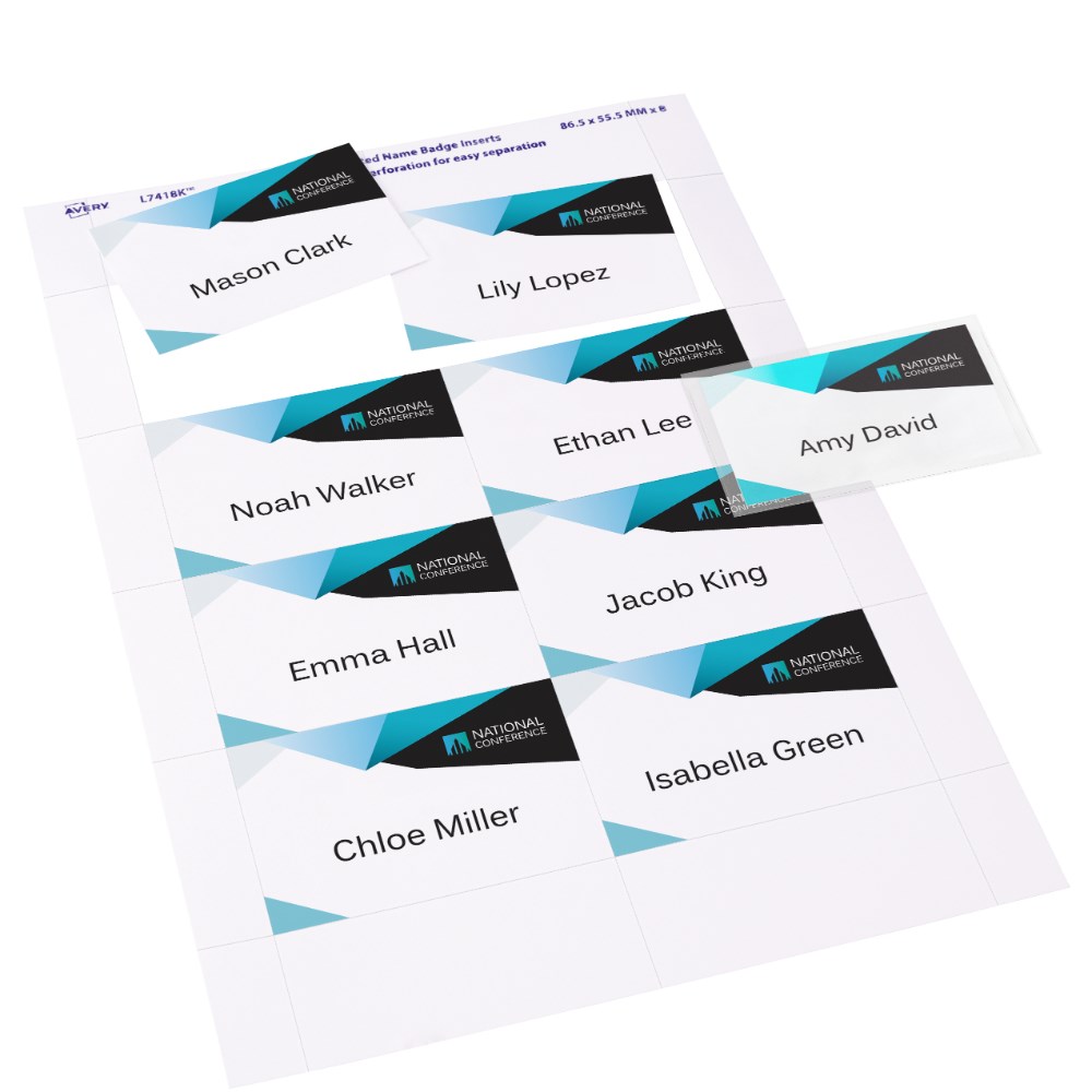 • Kit contains 10 reusable magnetic badge holders, 2 sheets of 150gsm printable insert cards, each with 8 perforated name badges.