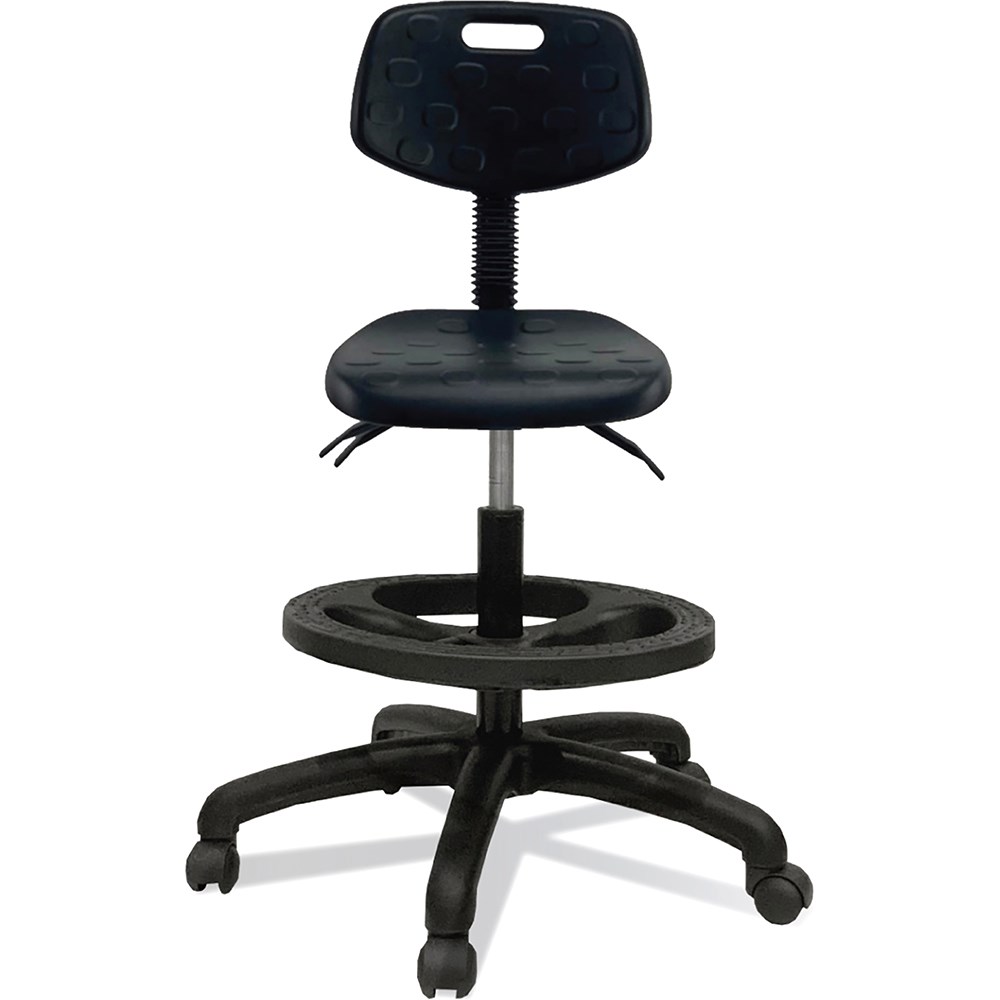 • Composition: Polyurethane Back. Chemical Resistant Seat. 5 Way 640mm Commercial Grade Nylon Base. Twin Wheel Castors.