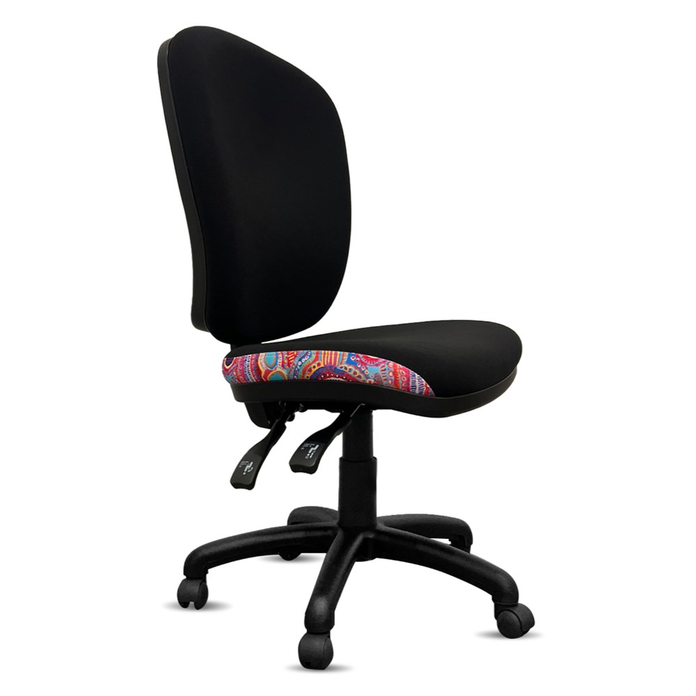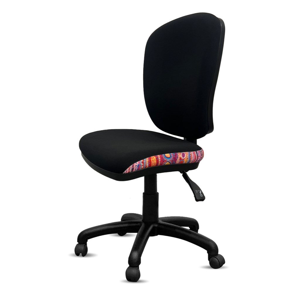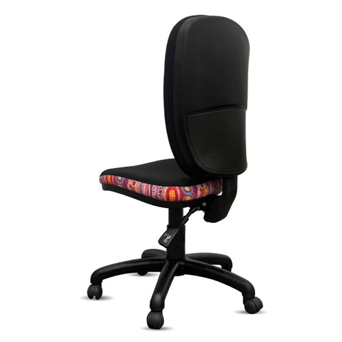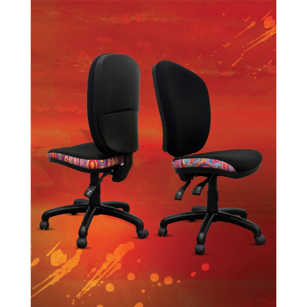 • A unique commercial fabrics designed by Murdie Nampijinpa Morris (Indigenous Artist) combined with K2 Black Fabric to upholster the chair.