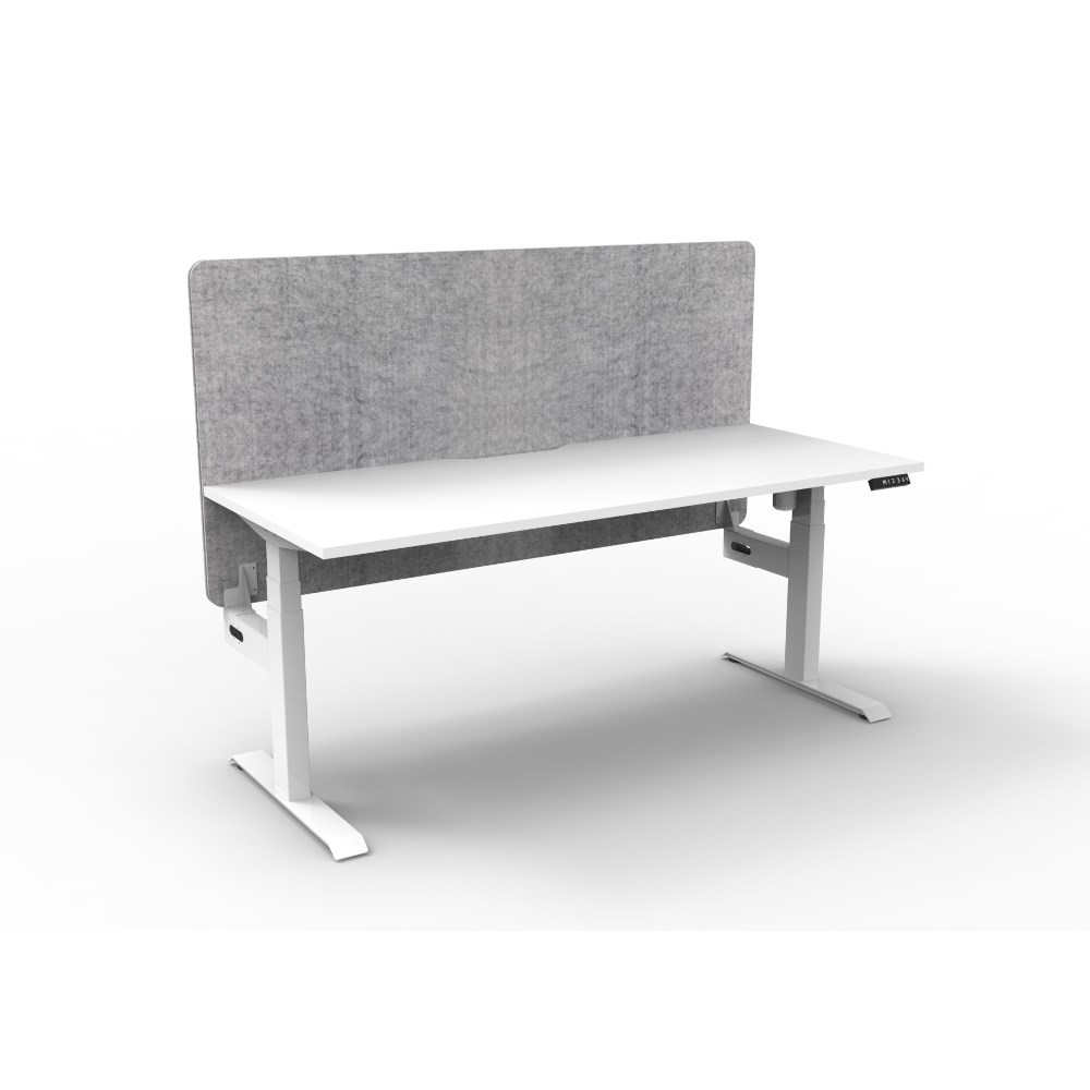 • Electric height adjustable single sided workstation with Natural White top and White Satin frame, Grey Eco screen.