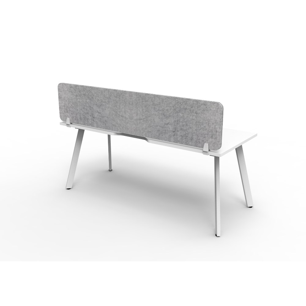 • Natural White worksurface with rigid edging and 410mmW x 50mmD scallop cable access. White Satin powder coat frame. Eco screen.