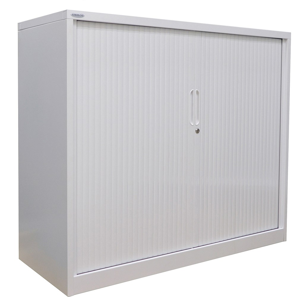 • Steelco Tambour Door Cupboard Includes 3 Shelves 1200W x 463D x 1200mmH Silver Grey