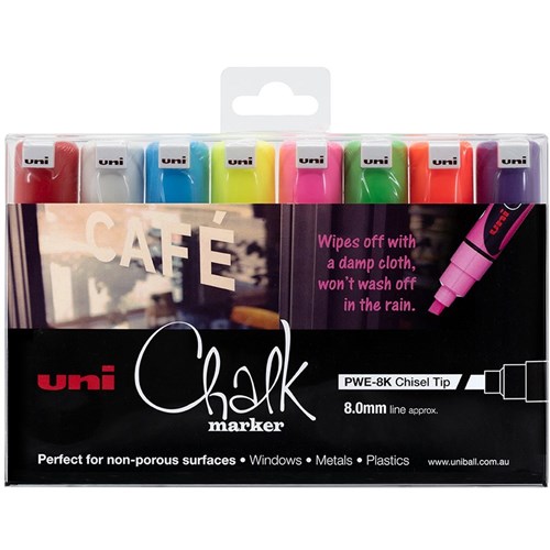 Uni Liquid Chalk Marker 8.0mm Chisel Tip Assorted Colours Pack Of 8